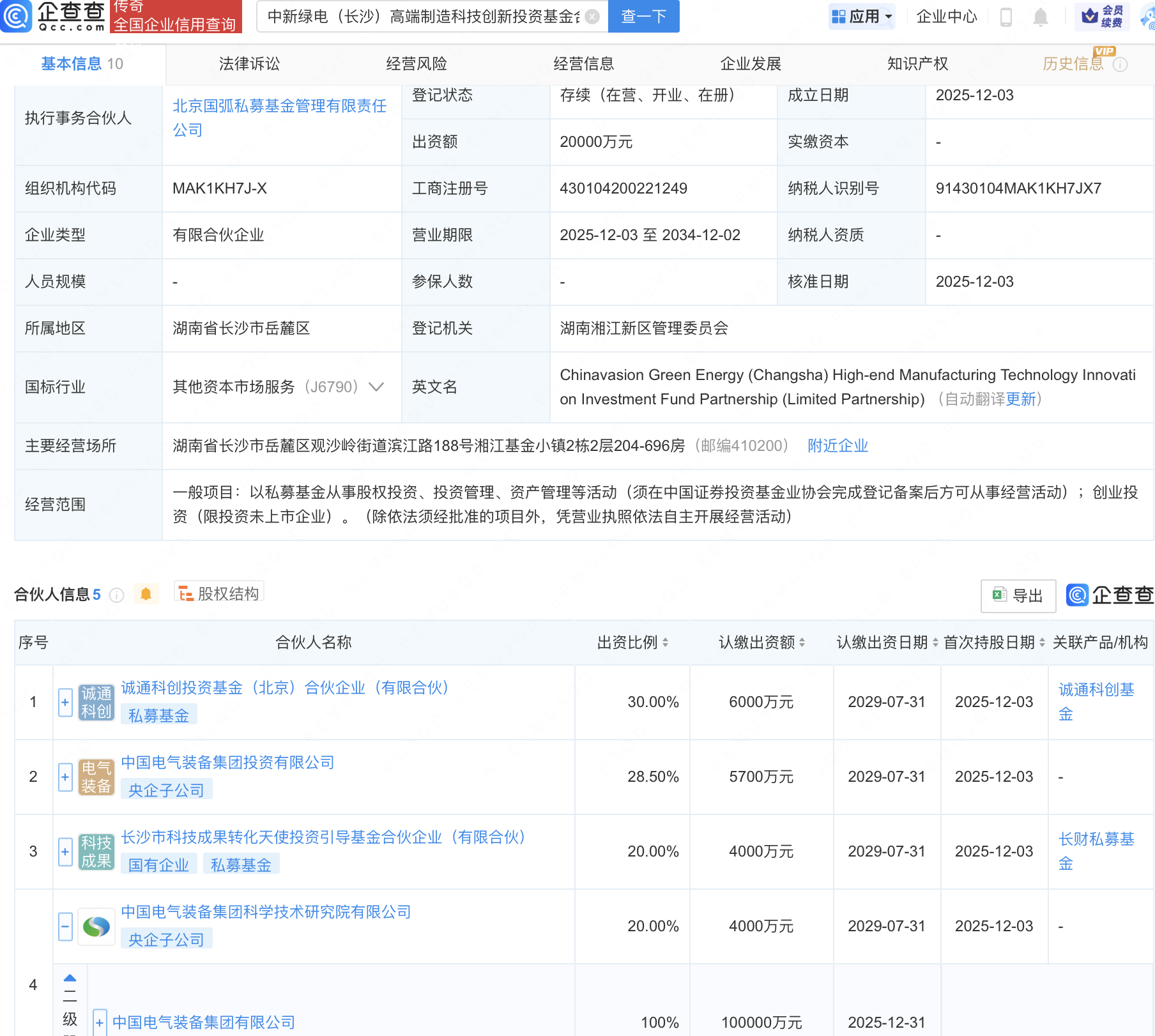 近日,中新绿电(长沙)高端制造科技创新投资基金合伙企业(有限合伙)成立,出资额2亿元,经营范围包含:以私募基金从事股权投资、投资管理、资产管理等活动。企查查股权穿透显示牛人配资,该企业由诚通科创投资基金(北京)合伙企业(有限合伙)、中国电气装备集团有限公司全资子公司中国电气装备集团科学技术研究院有限公司等共同出资。