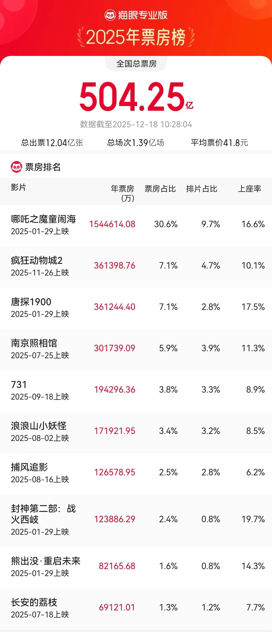 其中,《哪吒之魔童闹海》以154.46亿元的总票房位居榜首,贡献了全年票房的30%以上。