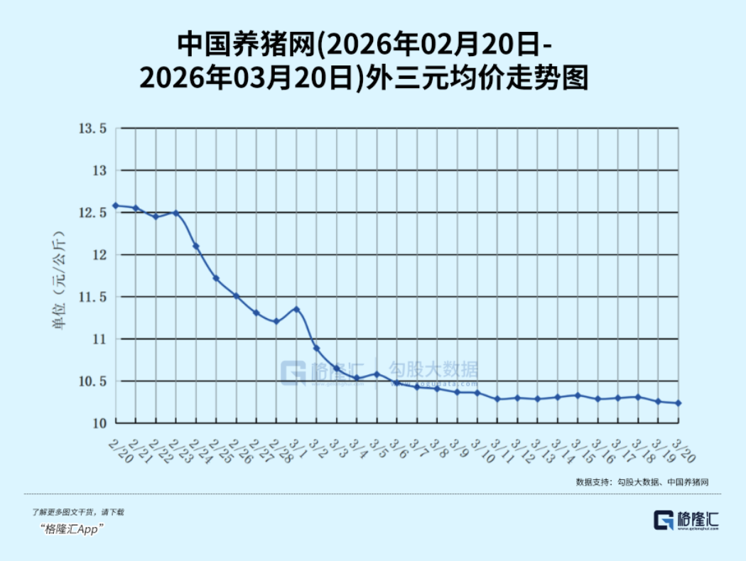 中国养猪网监测数据显示,截止3月20日,全国外三元生猪出栏均价已然跌至10.24元/公斤,即将跌破10元/公斤的心理支撑价位。