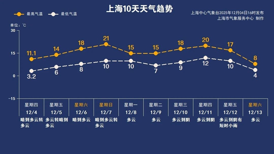 今天(12月4日)早晨上海迎来下半年最冷清晨,郊区全线跌破冰点,中心城区徐家汇站也仅3.2℃。好在白天阳光上线,气温小幅回升,最高气温普遍在10~13℃之间。虽然还是冷,但比昨天稍微暖和了一点。