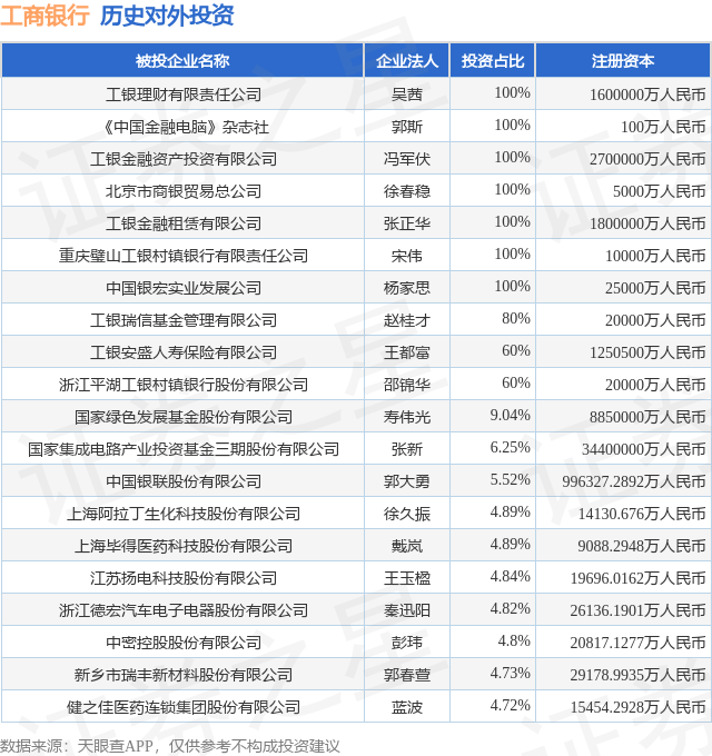 本站消息配亿多配资,根据天眼查APP显示,工商银行(601398.SH)新增一起对外投资事件,被投资公司为安徽鸿路钢结构(集团)股份有限公司,法定代表人商晓波,投资占比为1.43%。该公司从事金属制品业配亿多配资,注册资本为69001.0824万人民币。目前,工商银行共存在对外投资1467项,投资占比前20的项目见下表:
